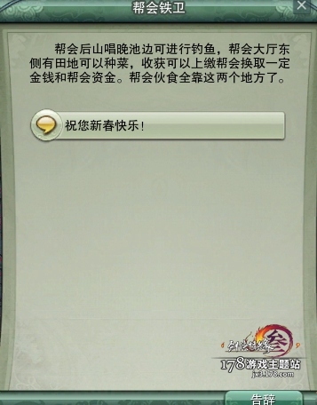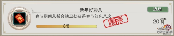 这个成就给大家提供一个比较好完成的地点,一进门忠义堂门口有好多的帮会铁卫,左边4+1个,右边4+1个,一共是10个,跟帮会铁卫对话有一定几率会获得吉祥红包,10个帮会铁卫对话下来一圈脸好的能有5,6个红包,脸差的也得有3,4个,所以只要每天都来坚持做一下或者再把帮会的其他地方的帮会铁卫对话一下,只要拿到八个红包就拿到了这个成就。