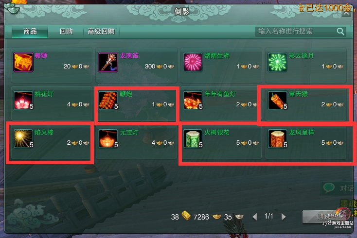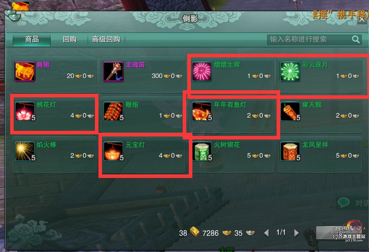 同样,这些花灯和烟花都可以通过砸罐子拾取获得,都是有一定几率掉落的,所以你只要挂着机砸罐子获得这些材料后制作出来放飞即可拿到这个成就,没时间去砸的小伙伴们我也给你们准备了方便又快捷的方法【但花钱】,还是找玉女倒影对话,可以看到她的商店界面有三种基础花灯和两个烟花售卖: