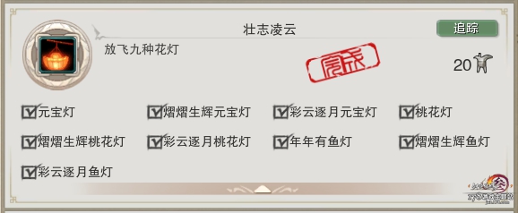 这个成就要九种花灯都放飞一遍才能完成,首先是三种基础花灯:元宝灯,桃花灯,和年年有鱼灯,这三种花灯和两种烟花:熠熠生辉和彩云逐月相结合可以制作出另外六种灯:熠熠生辉元宝灯,彩云逐月元宝灯,熠熠生辉桃花灯,彩云逐月桃花灯,熠熠生辉鱼灯,彩云逐月鱼灯。制作方法:右击烟花再左击花灯,即可制作成功。