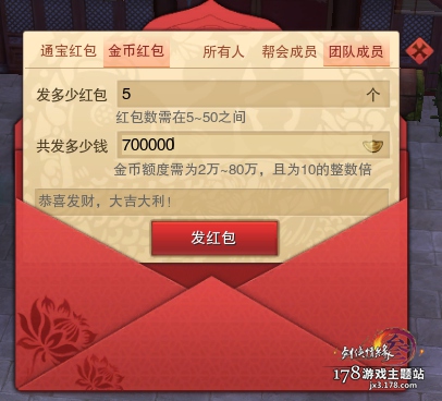 左边选择金币红包,右边选择团队成员,然后红包写3个【按实际人数来写】,然后写发70W金,然后随便写句话,然后发红包,这时候团队里的人员可以捡到你发的红包,然后让他们把钱再给回你来,然后再发出去70W金,然后再给回来,然后再发出去70W金,这样发三回后你就总额发了210W金,千金散尽还复来的成就要求发放200W金,此时我们已经超额完成了,所以肯定是可以完成这个成就的,也就拿到了摇钱树这个奖励物品。同时我们的挥金如土的要求发放20W红包的成就也肯定早就完成了对吧。
