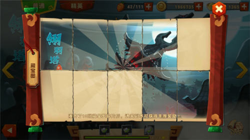 1、每章地图的普通闯关模式的右下角都会有一个地图碎片的收集情况展示,满足10个藏宝图碎片就会亮起来,点击可进去藏宝图的闯关模式界面。