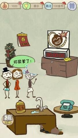 眼看炸弹要爆炸,怎样才能让他停下来呢,其实很简单,点击坑爹男老爸,看到老爸被吓尿了。继续点击他,他就会掏出大象来把炸弹熄灭了。。