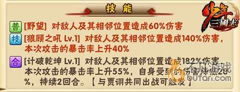 合击:对敌人及相邻位置造成182%伤害,本次攻击的暴击率上升55%,自身受到的伤害降低20%,持续2回合(与贾诩共同出战可触发)