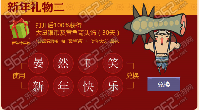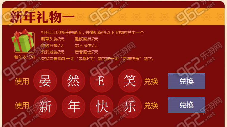 答:礼物一是“新年快乐”和“晏然E笑”里有任何1组4个字就可以兑换,奖励是头饰7天 礼物二是“新年快乐”和“晏然E笑”全部8个字兑换,奖励是2500左右银币和7天头饰 >>详细