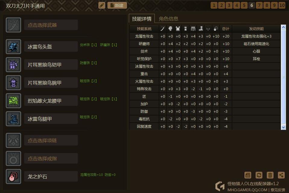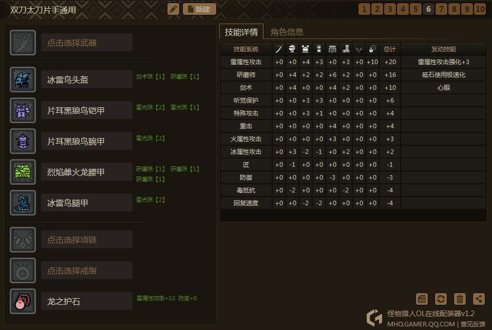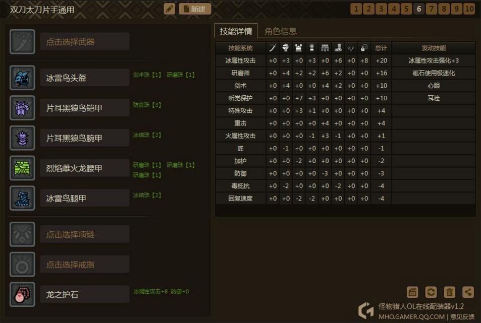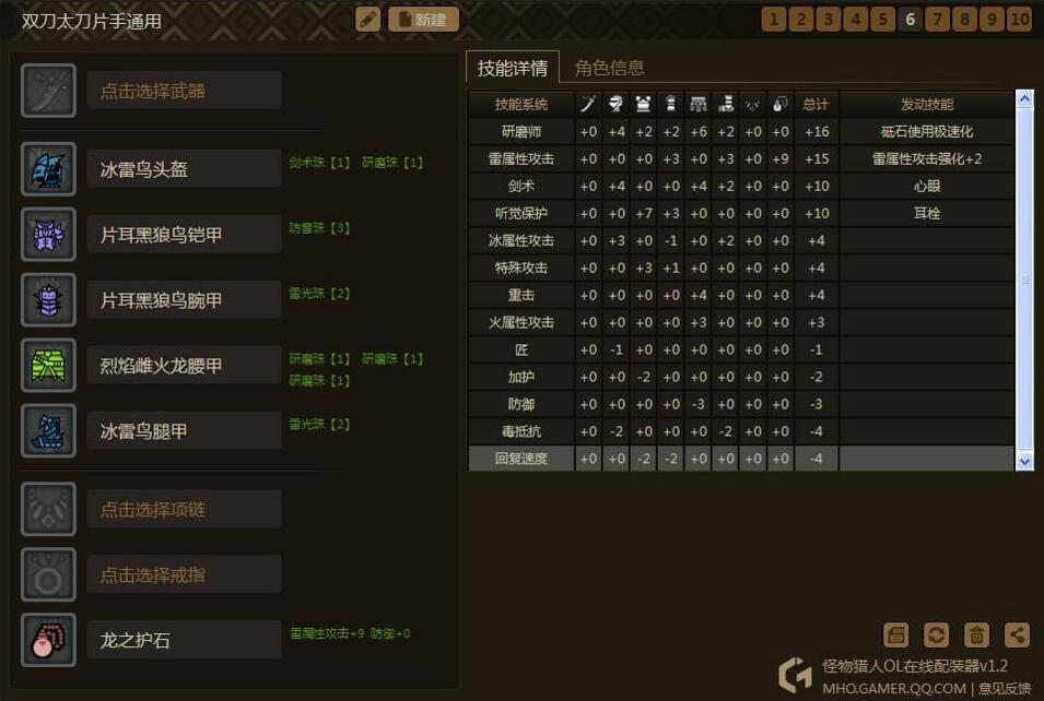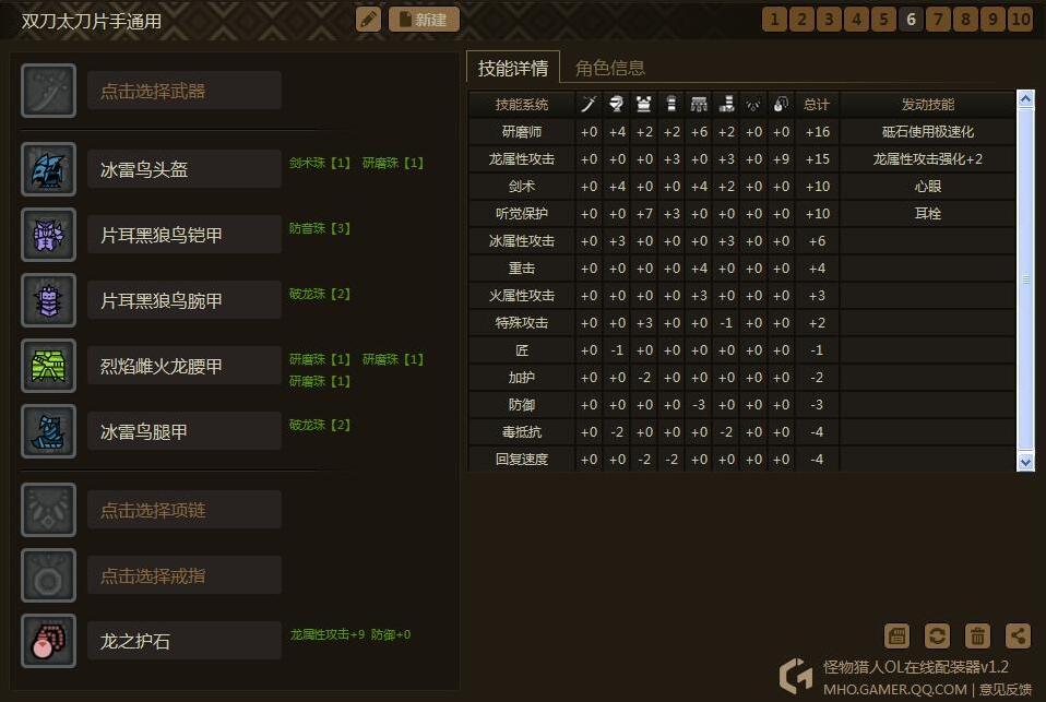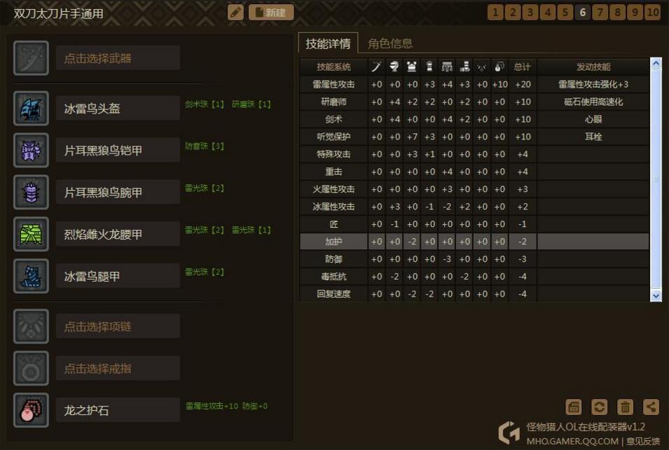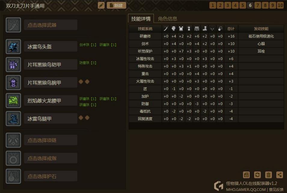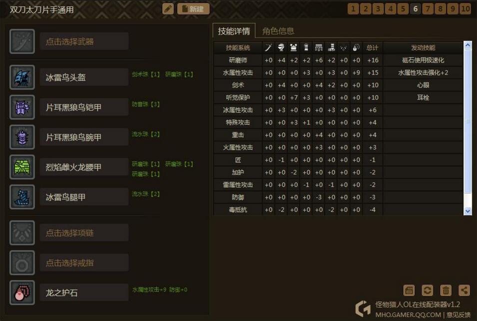 思路是围绕3个技能:心眼、耳栓、极磨。然后只需要换相应的属性护石和少量装备,就可以出一个属性的套装了。为什么要出心眼耳栓极磨呢?因为这心眼和极磨这两个技能有很多装备是同时具有其中两种技能点的,非常容易出,而且也很适合双刀。耳栓我比较喜欢,毕竟打着打着被吼断了攻击也是很烦的,说不定还会被怪摸到,这样减少很多输出。这套装备同样通用于属性太刀、片手。相当于你出5套装备,可以通用5属性的3种武器。是不是很心动?