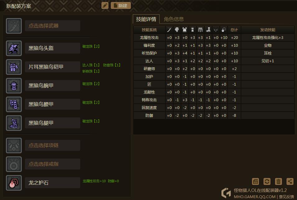 同样 这套防具 适合五属性 只要换护石和防具的珠子 ~ 另外ps: 属性双的主要输出来源 是武器强化和项链 套装技能的20 只有15点面板