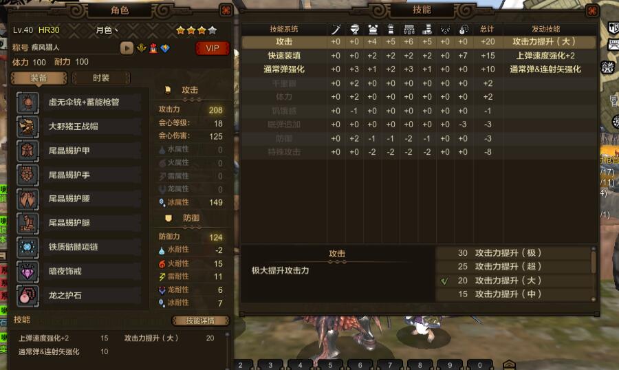 装备如图:护石选择快速填装 2 即可,除非是快速填装7,否则没什么区别。衣服上面珠子是 3个攻击2 2个攻击1 头上的孔 没有打珠子