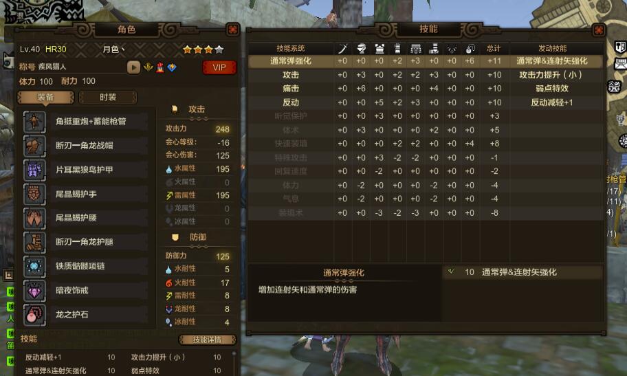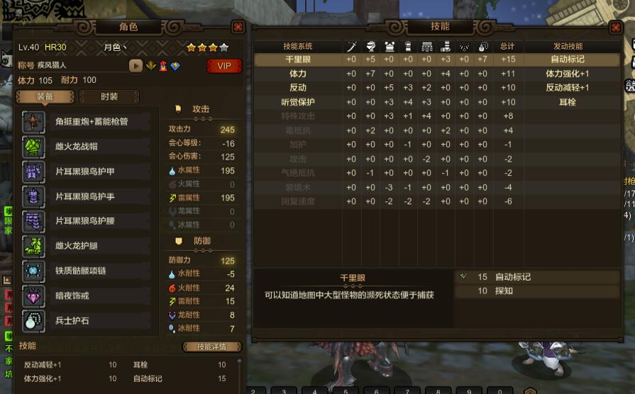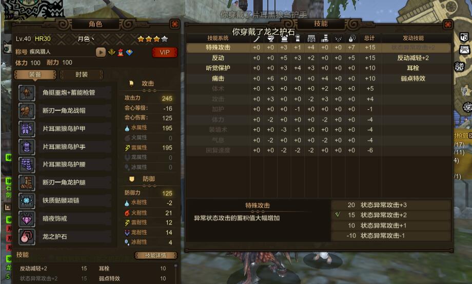 具体配装如下:护石是非常便宜的千里眼7,头上有一颗千里眼1和体力1,身上是4个反动1 1个防音 2个特攻 用的龙弩的那个配置 特攻并没有触发