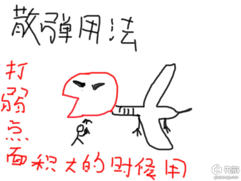 清小怪效果极好,散弹打出的伤害不会被怪抵挡,面前小怪全吃,但是单发伤害低,攻击距离非常近,要掌握好子弹射出距离,虽然单发伤害低,但是如果全部命中,伤害高于通常弹,速龙王可以吃满散弹伤害。虽然他们体型小,用途不是很广泛,用来打肉质相同的怪物,散弹主要用来打千狩头部攻击次数,效果很好。青怪鸟的头、镰蟹的腿这种肉质相同的怪物适合用散弹。