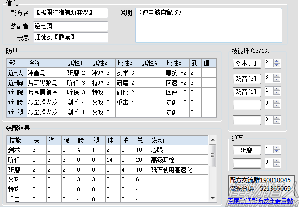 因为是给麻双用的配装所以在属性攻击上没给任何的照顾一切,出的技能都是功能性的技能。下面简单介绍一下: