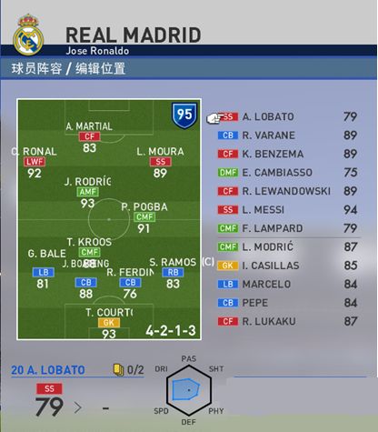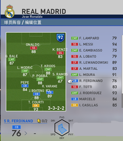 开始的几天第一赛季,我碰到了国家队归来的马德里德比,经历了无状态的国家德比,经历过可能电脑爆红的国家德比。。面对着马竞的疯铲+各种过顶,面对着巴萨的msn各种乱跑。我也迷茫过,我屮艸芔茻这怎么踢啊,之前13集大成的334阵型我已经接近质疑的边缘,一度想放弃3中卫体系,打 433,在防线上再加一个人,因为我也面对过3中卫凑不齐的情况,所以我也有一套433阵型。但是坚信三中卫体系的我,决定拆掉334的一边,也就是将一边的边路和中锋撤掉,也就是把花一亿买了个左后卫的梗。。。拉莫斯去边后卫吧,既然准备玩极致大巴防反就不需要上抢中后卫了,拉莫斯去打边后卫好了,利用身体下底。于是我搞出了这个左右不对称的阵型,所有进攻都是从边后卫开始,就是简单粗暴3套战术不断尝试。