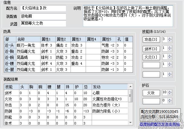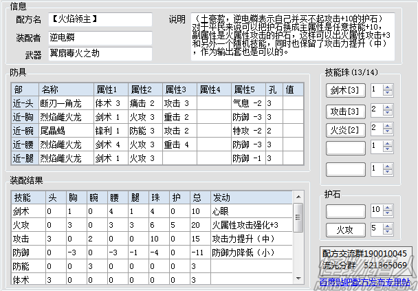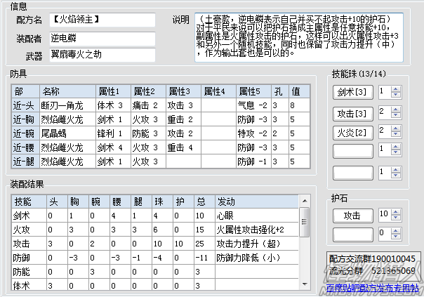 但是这两套的难点是护石是攻击+10和火属性攻击+10,对于平民来说不太容易实现,所以我的建议是把护石换成主属性是任意技能+10,副属性是火属性攻击的护石,这样可以出火属性攻击+3和另外一个随机技能,同时能还有攻击力提升(中),作为纯输出套装来说也是可以的,如下: