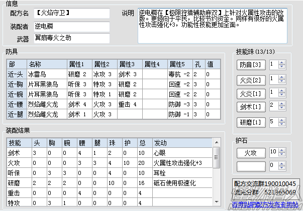 心眼、极磨应该是双刀最青睐的技能了,任何肉质所向披靡。耳栓用于保命以及及时的输出和走位。火属性攻击强化+3可以最大程度的提高火属性攻击,使这套配装变得攻守兼备,故名【火焰守卫】。