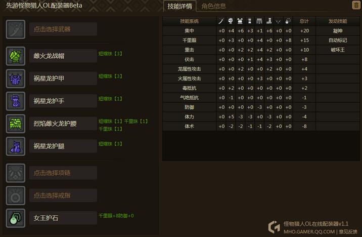 答:技能: [凝神]、[破坏王]、[隐秘]、[刺杀术 1] 使用防具: [星龙战帽]、[祸星龙护甲]、[祸星龙护手]、[烈焰雌火龙护腰]、[祸星龙护腿] 使用技能珠:短缩珠[3]x2、短缩珠[1]x3、忍脚珠[1]x4 使用护石: 集中 3 >>详细