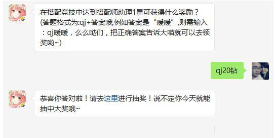答:奇迹暖暖在搭配竞技场中达到搭配师助理1星可获得20钻石的奖励哦,答案是qj20钻石。 >>详细