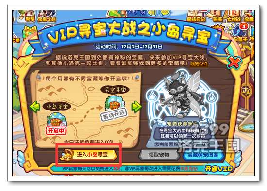 2、点击进入小岛寻宝即可参与活动,参与寻宝大战中每获得5次胜利可以领取一次宠物