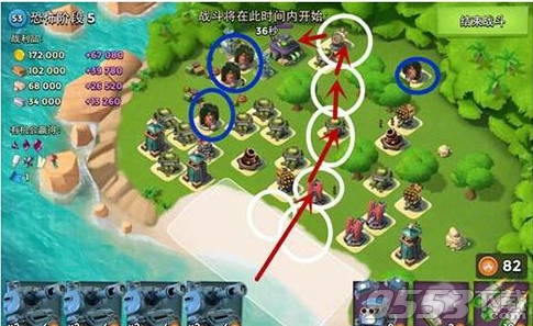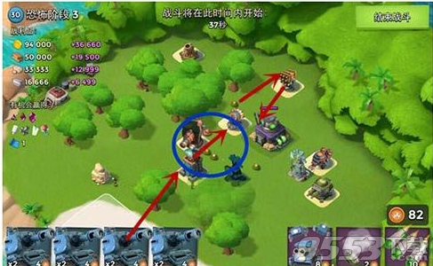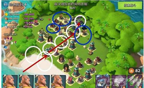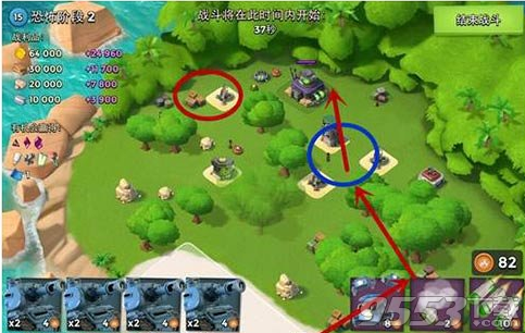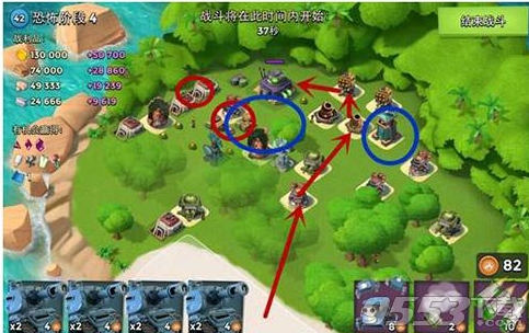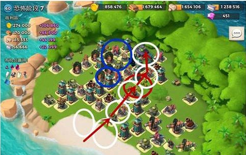 坦克从左侧登陆拆防御建筑收集能量,然后在炸掉红圈内的防御建筑,菊花器一定要拆掉,最后能轻松拿下基地。