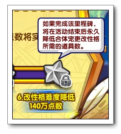 当全服所有玩家的点数集合到140万,即可完成奖励里程碑;将在本活动结束后永久的降低更改合体宠物性格所需的道具。