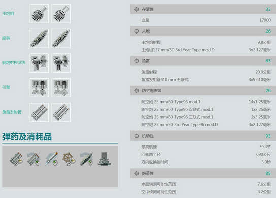 鱼雷方面,3座5联装氧气鱼雷,航速67节,白板单发最大伤害21000左右,升级之后23000。