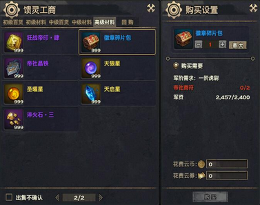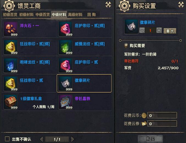 帝社商店购买徽章碎片必须消耗帝社商符,军阶达到“1阶虎尉”的玩家可以在高级材料处购买徽章碎片包,相对单独购买碎片可以节省少量军资。