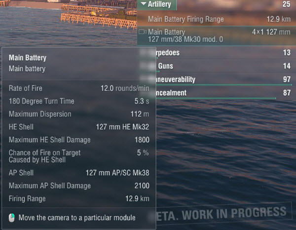然后说推进系统,也就是船速。不得不说战舰世界对比同类海战游戏的优秀之处在于细节上的还原,比如说这个推进系统。在战舰世界里,船速受很多因素影响,包括排水量,体积,舰体线型以及推进功率等等,船从启动到最高航速需要一个加速时间,当然想把船停下也需要一个刹时间。这样的机制比较科学,不像海战世界,海面上行驶的战舰竟然可以像汽车一样瞬间刹车下一个瞬间就华丽转身后退。战舰世界里航速很多时候用“节”作为单位(1节=1海里/时=1.852公里/时)。最快的驱逐舰,可以达到40节的最大航速,巡洋舰的最大航速约为35节,低速战列舰和航母的最大航速则在25-28节。当然除了航速之外,转向半径也对船的灵活性影响深远,尤其是在躲避鱼雷的时候。