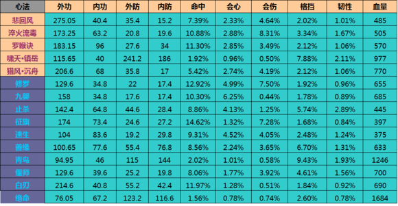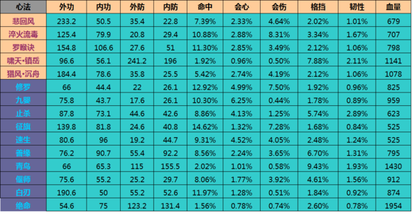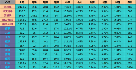 可以贴出来分享一下,最好除去心法的相生,那可以最直观的计算出这个心法的属性。