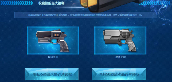3、玩家在拥有光辉使者之怒的权限后,可以去【收藏控的最大福利】处,使用蓝水晶碎片直接兑换其他副武器到游戏内,每把武器只可兑换一次;