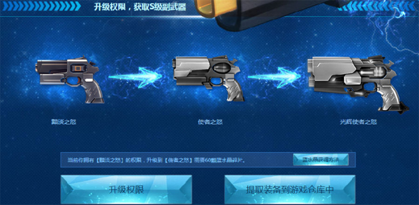 2、活动期间,所有打开页面的玩家都将获得黯淡之怒的使用权限,玩家可以通过使用蓝水晶碎片,升级权限,获取更高级的副武器。注意:权限暂存于网页上,如果需要提取装备到游戏内,必须点击【提取装备到游戏仓库中】按钮,每个玩家只可提取一次装备,默认提取当前拥有的最高等级的装备;