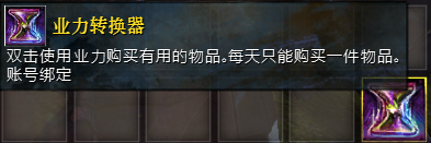 每天(早上8点重置),双击业力转换器,会出现3种道具可以购买,三选一。