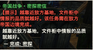 今天小编给大家带来的是关于天谕帝国战争密探密信任务流程分享,小伙伴们一起来看一看吧。天谕帝国战争密探密信任务。本文内容主要分享的是帝国战争系列任务中的一种!主要需要我们玩家们在各处要塞的文件柜中找到情报并提交即可!但是不同的情报给予的奖励自然是不同的!那么我们就来看看这个任务的具体流程吧。