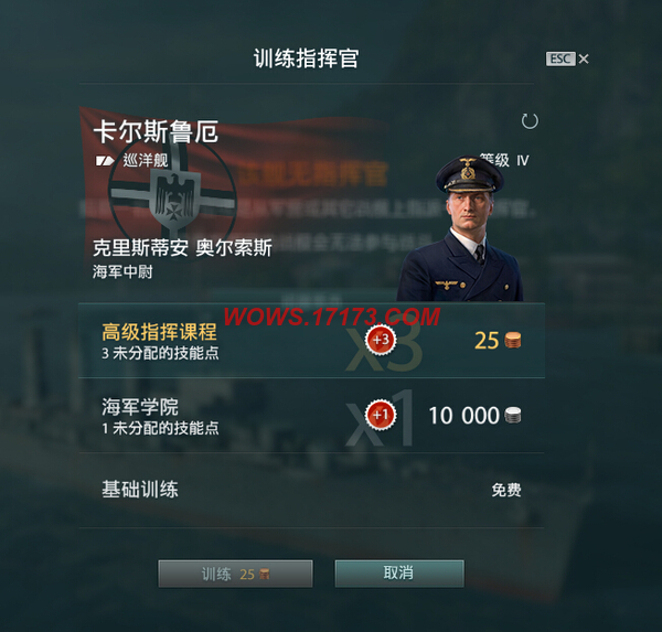 玩家在购买新军舰后,游戏会提示是否需要训练指挥官。其中高级指挥课程需要花费25金币的。玩家可以获得3点未分配的技能。各位非人民币玩家可不用选择高级指挥课程,可以花费10000银币选择获得1点未分配的技能,或者直接选择完全免费的基础训练,反正后续在游戏中也是可以获得未分配的技能!