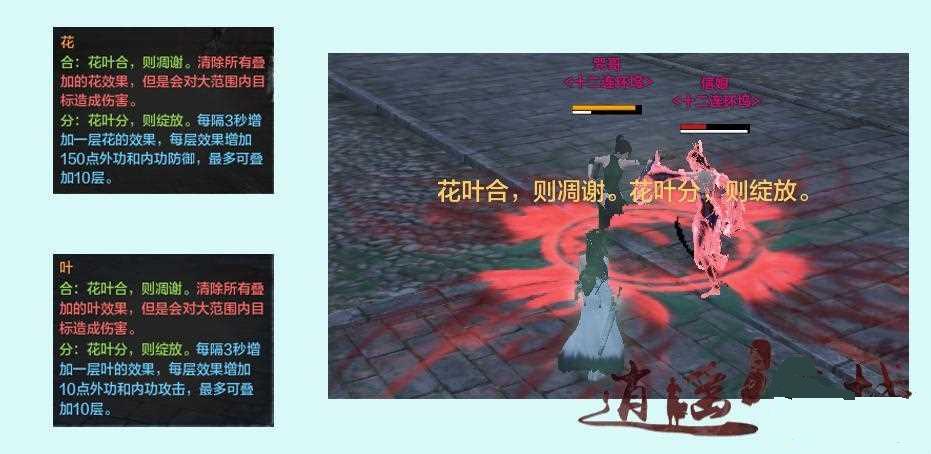 这个boss本身也没有什么厉害的技能,在战斗过程中会陆续召唤三只叫做咒哥小怪,第一只和第二只直接消灭,第三只出来的时候boss身上会出现一个“花”的buff,咒哥身上则是“叶”,这两个buff随时间会增加层数。打法是将咒哥和boss分开攻击,看小队情况,在buff层数较高的时候把他们拉到一起,这时他们会释放一个全屏的AOE技能,伤害中等,同时消去所有buff层数,然后再把他们拉开继续战斗。
