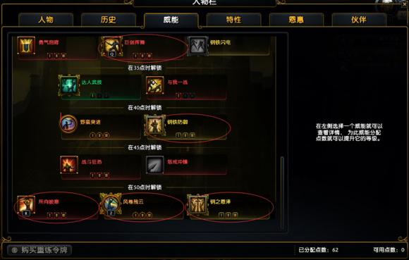 关于技能的,无冬里不管技能叫技能,他们叫威能,分为随意威能(普攻)遭遇威能(正常技能)和每日威能(传说中的大招)普攻无cd,遭遇有cd,每日的话要攒能量(游戏里叫行动点数,就是那个橙色六棱形的东东)才可以释放。在PVP跟在pve用的技能是不一样的,有时候效果会发生变化,所以要注意点。我自己对于巨武的技能点法