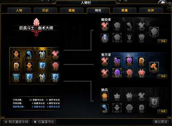 关于特性的,我点的不是全暴力,因为我一直坚信,站得住才有输出,直接被秒你伤害再高卵用都没有,而且伤害可以靠装备弥补(选暴击和穿透的)。势不可挡点满五点加25%的行动点(大招的能量)集聚速度,喜欢的可以点,不然去点顽强抵抗或者护甲专精都得。暴击几率是增加输出的重要特性,点满,第二行不解释,第三行的韧性你也可以加到护甲专精去,典范我选的毁灭者加输出,战斗狂怒是点给pvp用的,减少三个技能的cd两个技能的伤害和一个技能的持续时间。