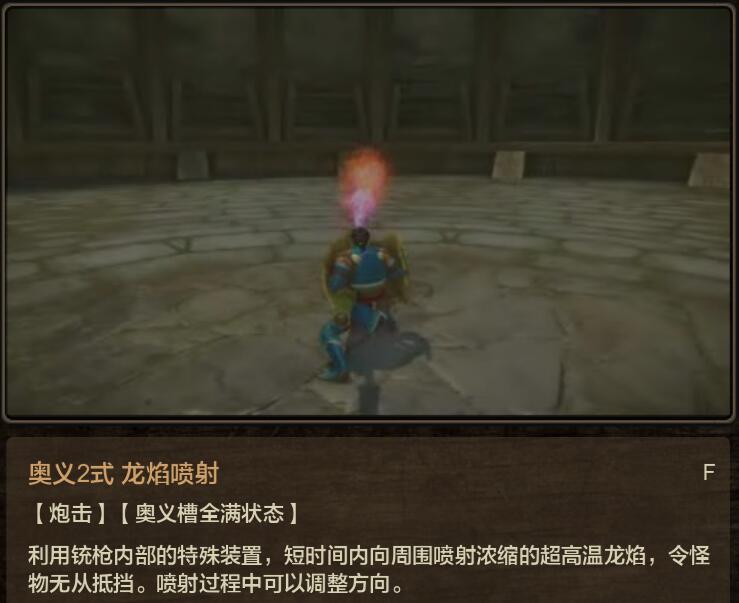 10、炽焰横扫,不弹刀,MHO基本全系列武器的15级招式技能都会让战斗发生变化,铳枪也不例外,这个炽焰横扫意义很大,可以积攒“龙焰槽”,伤害分为两部分,一部分是斩击判定(略低于叩击),一部分是喷射的火药(不受弹仓残弹量影响,不知道是不是BUG),综合伤害低于叩击接全弹发射,但是作为终结技收招很快,不需要天赋的情况下可以回避接全弹装填,发动时会消耗全部炮弹,喷射火药部分判定有点远,对于扫脚流而言,经常会打不到,天赋支持下可以不消耗炮弹还能接叩击,动作很帅;