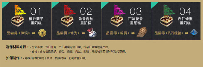 除了上面这些固有的任务外,重阳节的特色便是重阳糕了,而游戏中也有品尝重阳糕的玩法,品尝不同的重阳糕会获得不同的游戏奖励,详情参考下图: