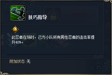 重点词3:“连击率提升40%”,相当提升了连击这一单一的附加属性。首先,土主体术攻击以及所有技能描述“一定概率发动X连击并附带XX”的忍者都可能起到作用,其次土主木叶旋风(击退)、裂地(小浮空)等也有了不同程度的提高,为土主普攻攻击后排提供了可靠的保证。