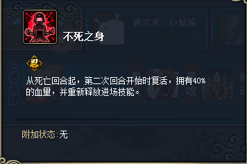 描述:“从死亡回合起,第二次回合开始时复活,拥有40%的血量,并重新释放进场技能”