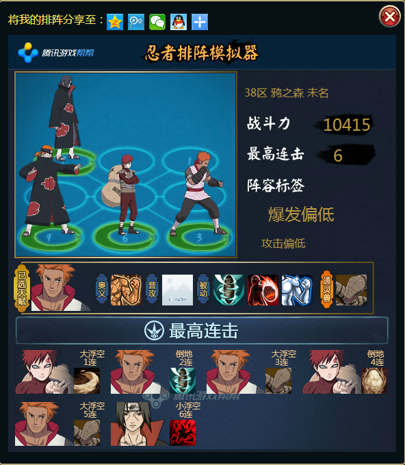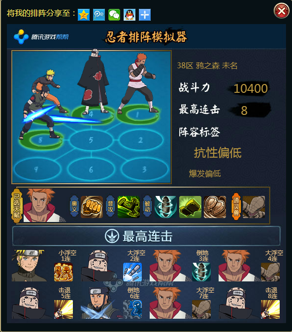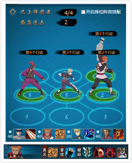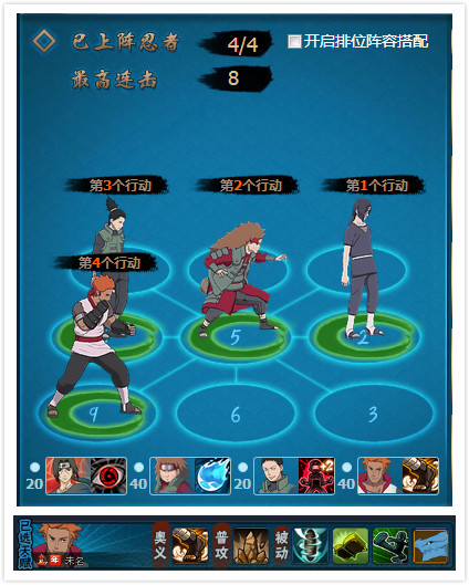 技巧指导+必胜,虽然第一回合输出可能有所提升,但是效果很难持续到第二回合。另外目前测试,最适合技巧指导的居然是鼬[须佐能乎]、丁次[忍界大战]和鹿丸,强行搭配如上图,第一回合输出客观,还有3个可操作技能,打出连击后可以附加更多的选择,但在下没有鼬进行足够的测试,理论上和主流阵容有一战之力。