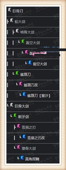 骨刀派生系,一角龙的材料制成虽然减了会心等级可是有天赋在还是不怕的,攻击可是45-50级的大剑只中最高的,45级能用上的话50级的图也不在话下了。