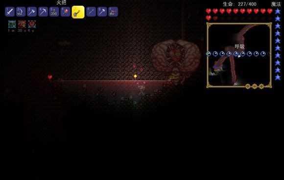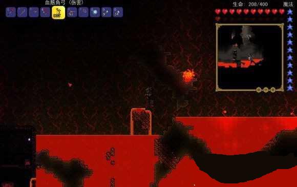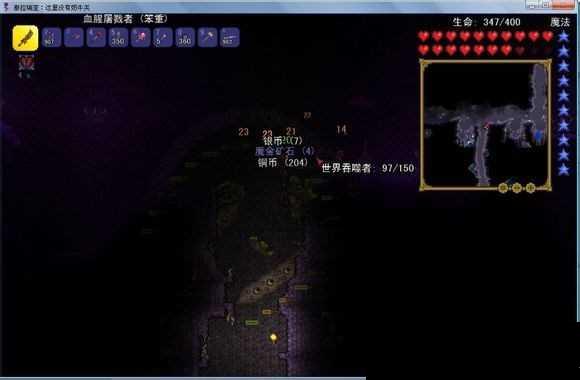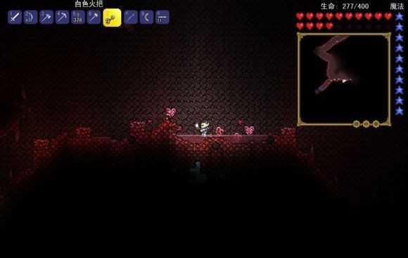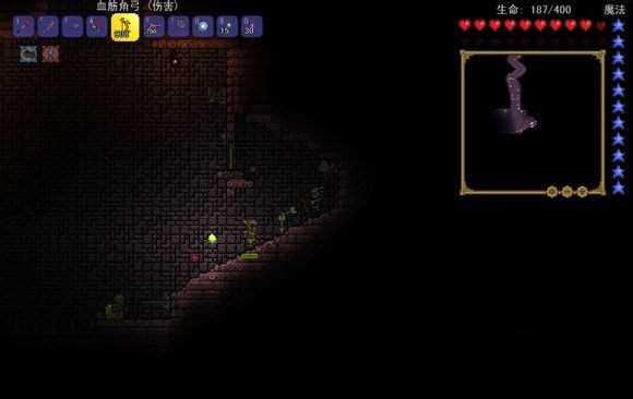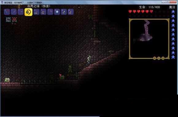 深入血腥之地(一个世界中血腥之地和腐化之地只能有一个)....人品真不错,身边有两个生命水晶,可惜血已经上限了。生命水晶旁边的一坨眼球是恶魔祭坛啊,再问砍手。血腥之地是个很可怕的地方。有红色植被覆盖,上有阴影木(黑灰色,造木剑攻击力为10)花纹还挺漂亮的,前期特殊生物有血肉之虫,巨脸怪,鲜血蜘蛛。血肉之虫有大中小三种,大的血有120,中等血有60,小的只有45。会飞,咬你一口伤害15左右。