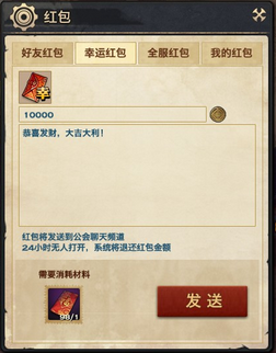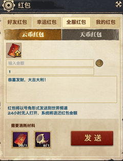 全服红包就是消耗一个红包和巨星号角,发一个你们服务器所有玩家都可以抢的拼手气红包,云币和天币均可,数量、金额你来定哦~