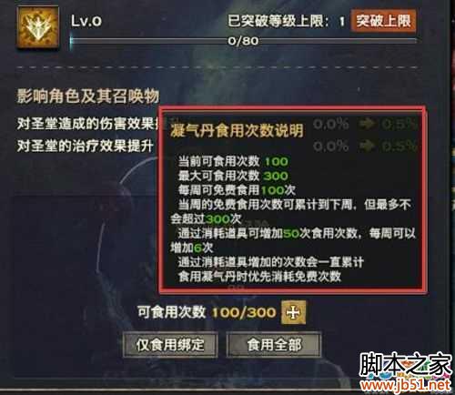 每位角色每周食用凝气丹有数量限制,每周可免费100次,100次免费次数使用完后可消耗道具增加食用次数,每次使用后可增加50次使用次数,每周限用6次,消耗道具增加的次数可以一直累计。