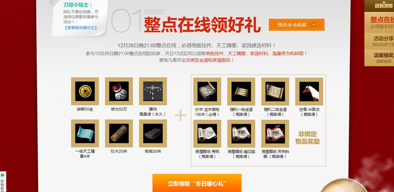 相信整点在线活动各位都很熟悉了,每次整点在线给的礼物也不乏良心之作,这次退出的“冬日暖心送祝福”活动,不仅仅是12月26日晚上9:00在线之后领礼包就结束哦。本次活动还有2个后续活动,2个后续活动,2个后续活动(重要的话说三遍)。
