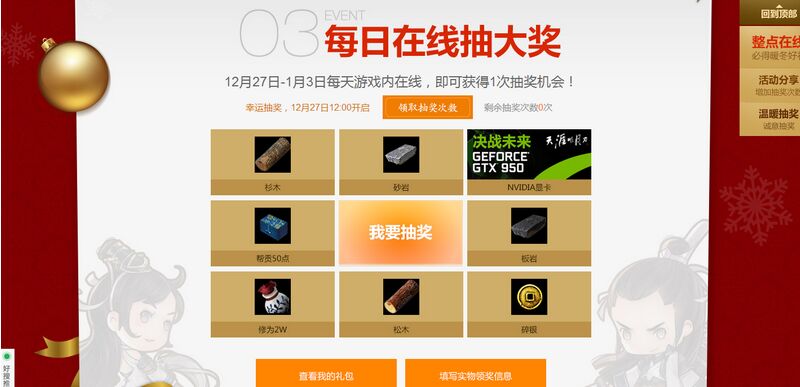 最后是一个从12月27日到1月3日的抽奖活动,每天游戏内在线,即可获得1次抽奖机会!开放时间是12月27日12:00,也就是说和领奖的开放时间是一样的,这个活动不仅要求游戏内在线才能抽奖,还是和第二个活动分享抽奖一样,“请完成12月26日21:00游戏内在线再来哦”。