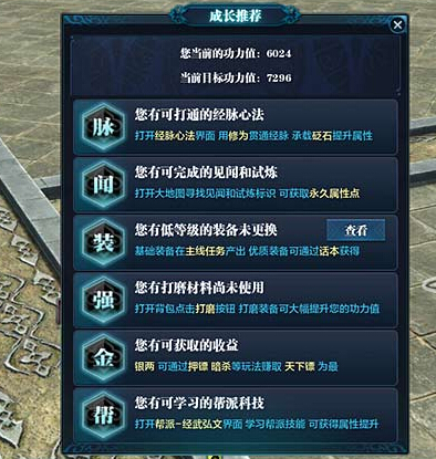 接下来我们就可以按照给予的提示来提升自己的功力值了