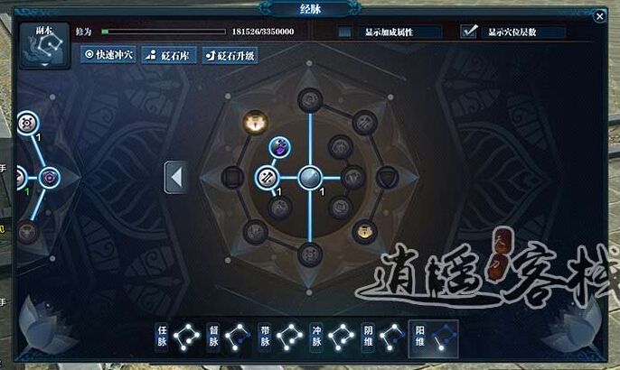 系统默认的N可以打开经脉系统,点击快速冲穴即可打通经脉,或者循着脉络优先打通你所需要的属性也是可以的。