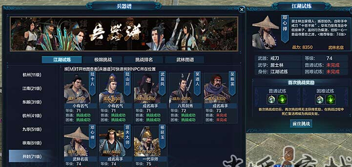 CTRL+G然后切换江湖试炼,寻找我们当前阶段对应的侠客,去挑战他磨练自己的操作。右键点击图片,还能详细获知他的短评,知己知彼更易获胜。
