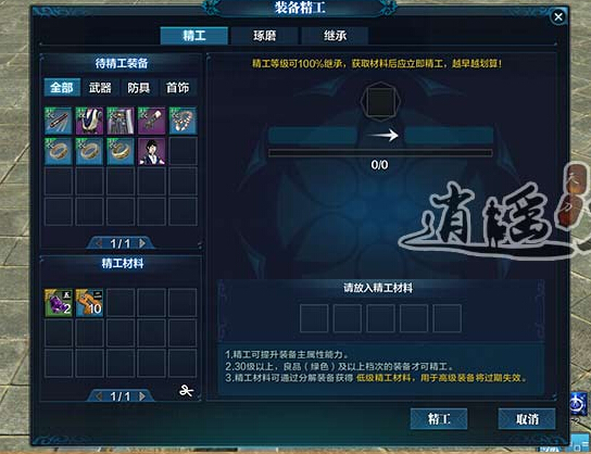 打磨分为精工、琢磨和继承三个部分,每个部分都能提升极高的功力值,使用都需要一定的碎银和材料,优先精炼自己所需的装备。