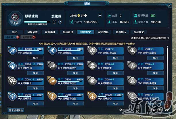 点击O键打开帮会界面,其中经武弘文就是帮会开启的可学习页面,在其中包含十余种属性提升和生产提升。我们选择适合自己的属性进行修炼。